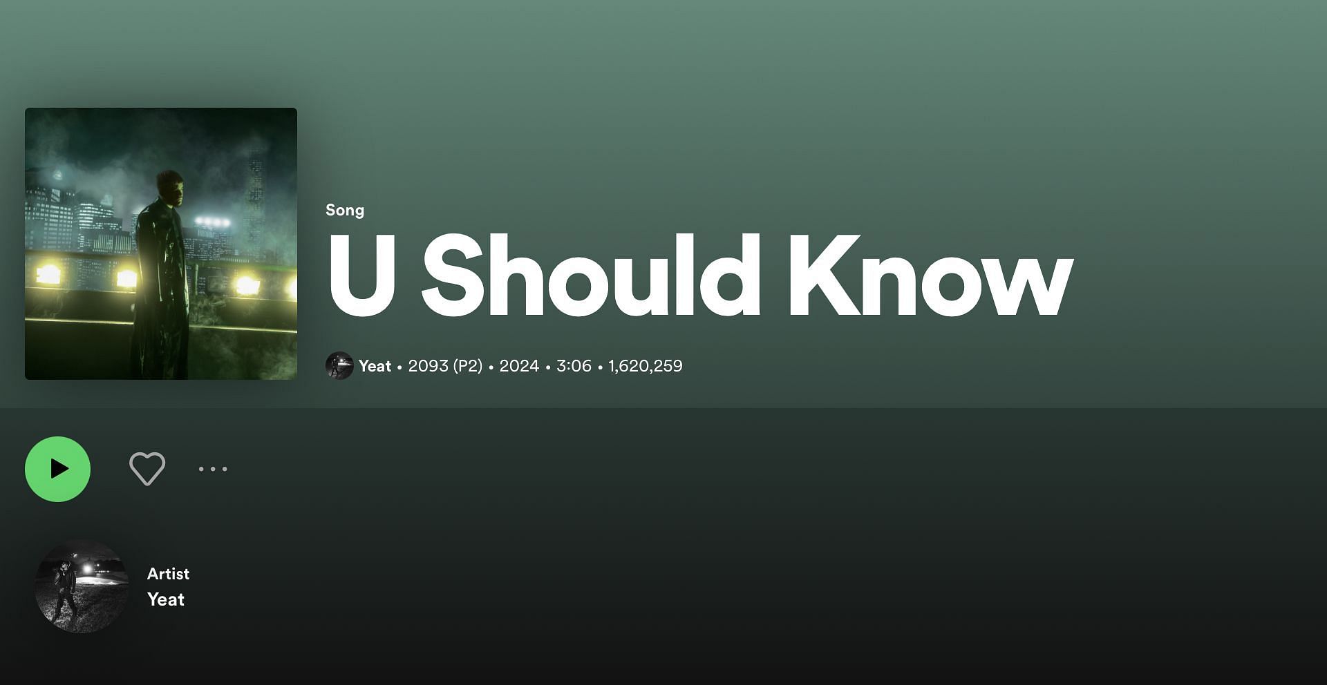 U Should Know is a song where the futuristic elements incorporated in the track blend seamlessly with Yeat's vocal performances, especially in the chorus.