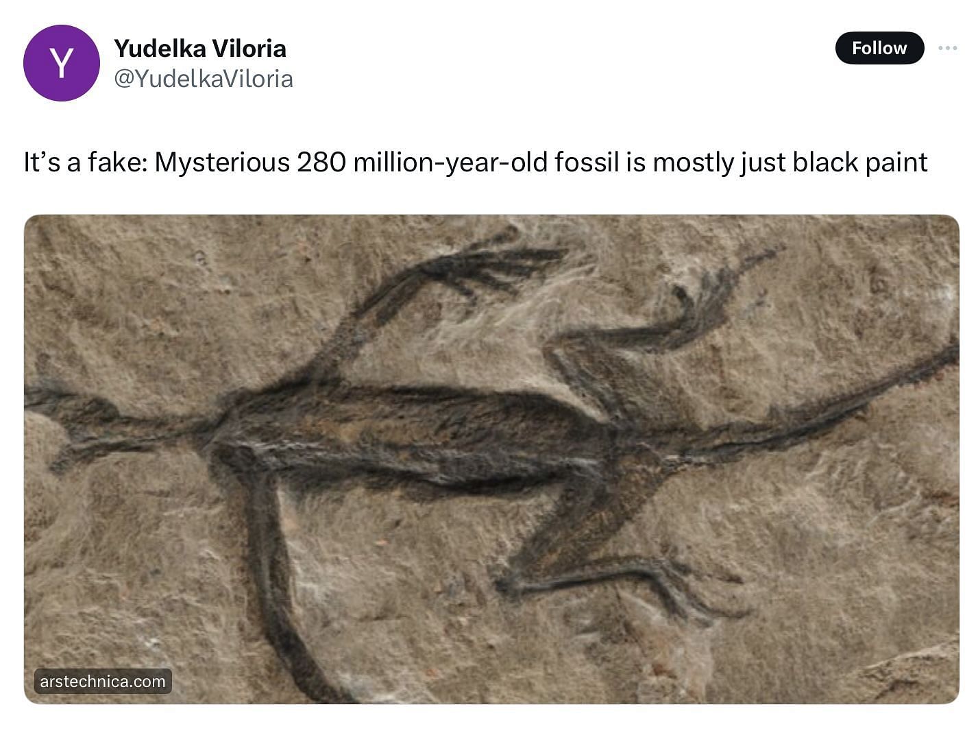 A new research paper revealed that a reptile fossil discovered in the Italian Alps in 1931 was a partial fake. What was initially thought to be the organically preserved soft tissue of a 280 million-year-old Tridentinosaurus antiquus is black paint.