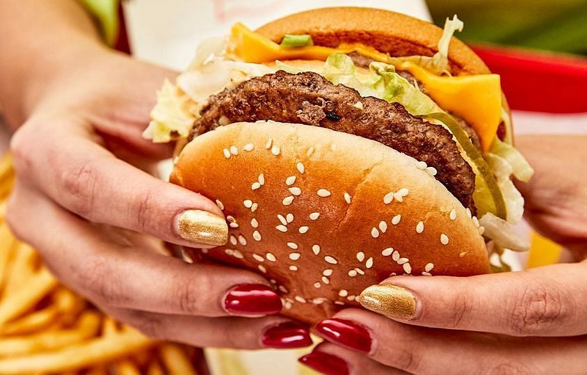 The company states that the beef patties are seasoned with salt and pepper, then cooked on a flat iron grill. Their toppings include onions, pickles, and two slices of cheese on a sesame seed bun. The company also states that this burger contains no artificial flavors, preservatives, or added colors from artificial sources, but their pickles do, which patrons can skip if they need to.