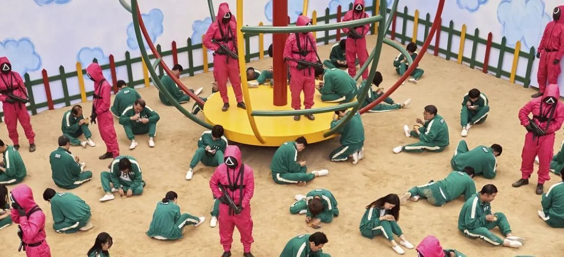 The players are required to wear green tracksuits, and masked guards in pink jumpsuits constantly keep an eye on them. The Front Man, who is dressed in a black mask and uniform, is in charge of controlling the games.