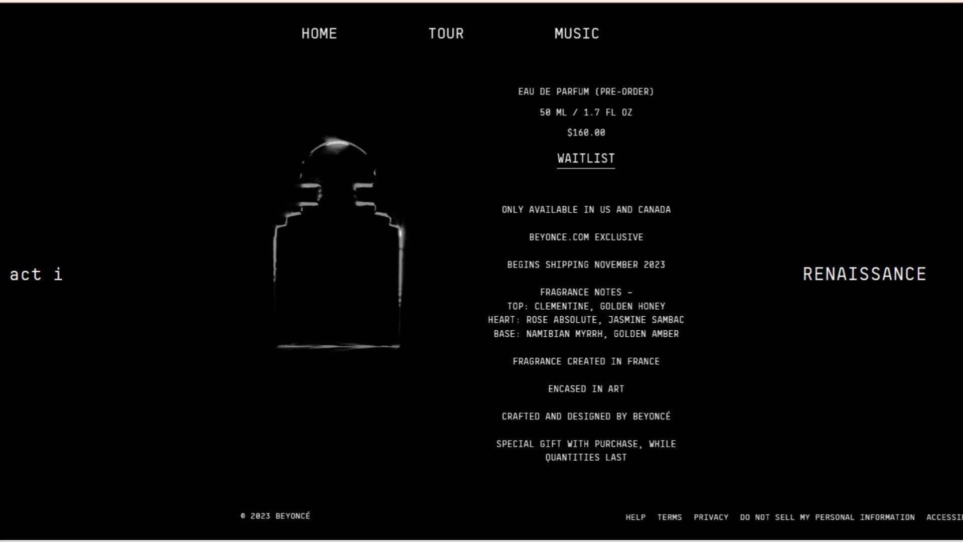 The perfume's description also states that bottles will start shipping in November 2023 and that each purchase comes with a "special gift." Clementine and golden honey are among the bottle's opening notes. Rose absolute and jasmine sambac are the heart components, followed by Namibian myrrh and golden amber for the base notes.