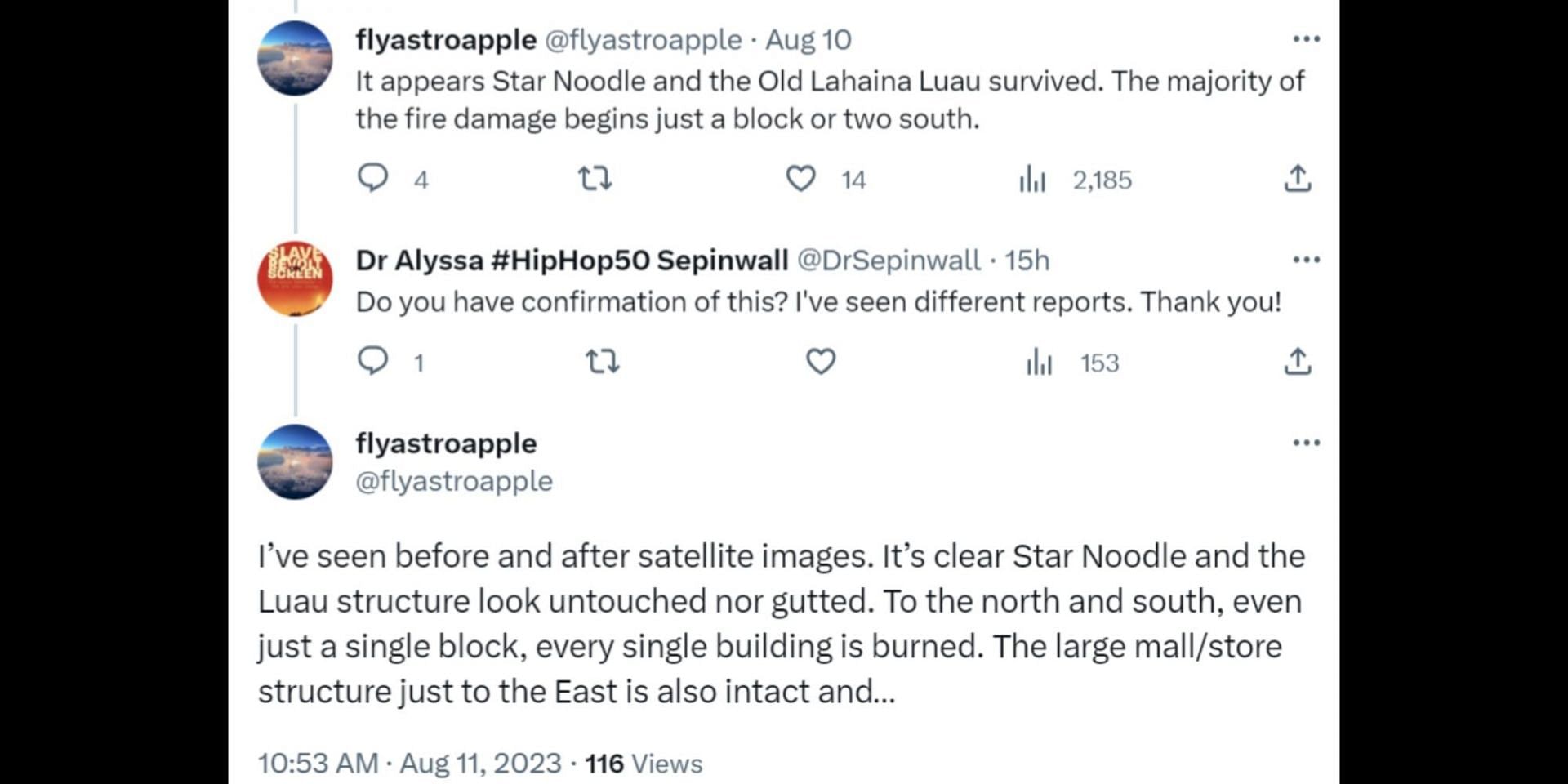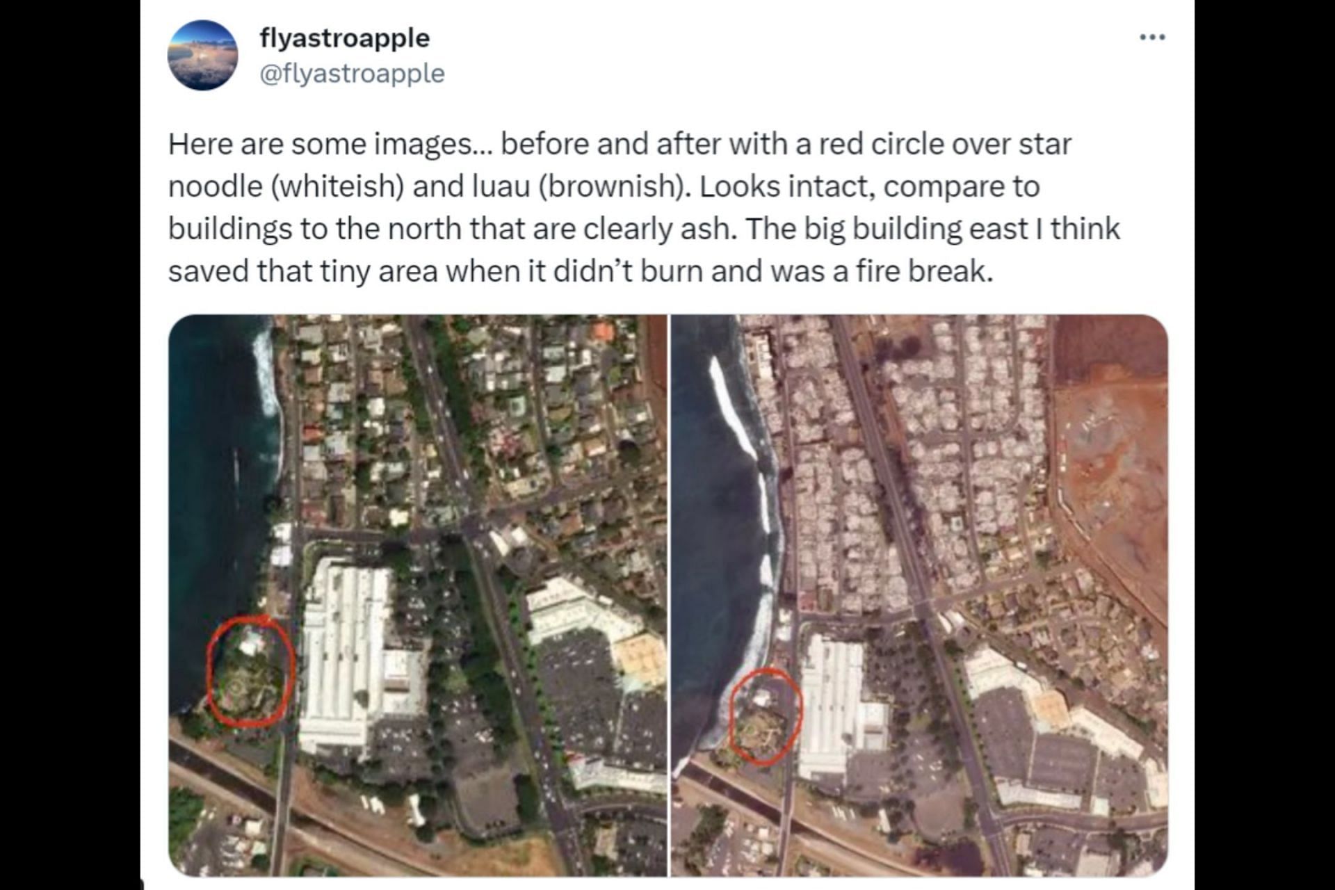 One user on X, @flyastroapple, shared before and after photos of images obtained by satellites. There, they circled the Luau and the Star Noodle in red, claiming that the circled area appeared intact compared to the surroundings, which visibly burned down.