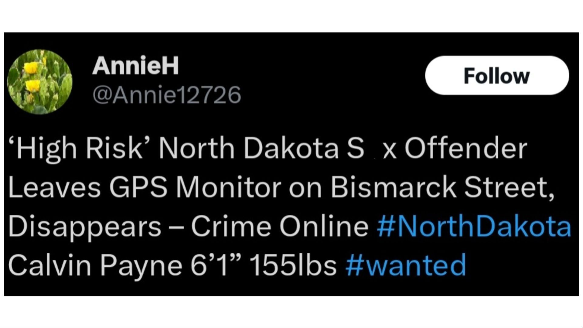 "Anyone with information about Payne’s whereabouts should contact their local law enforcement agency, Bismarck Police Department at 701-223-1212, or the Bismarck Parole and Probation office at 701-328-9700."