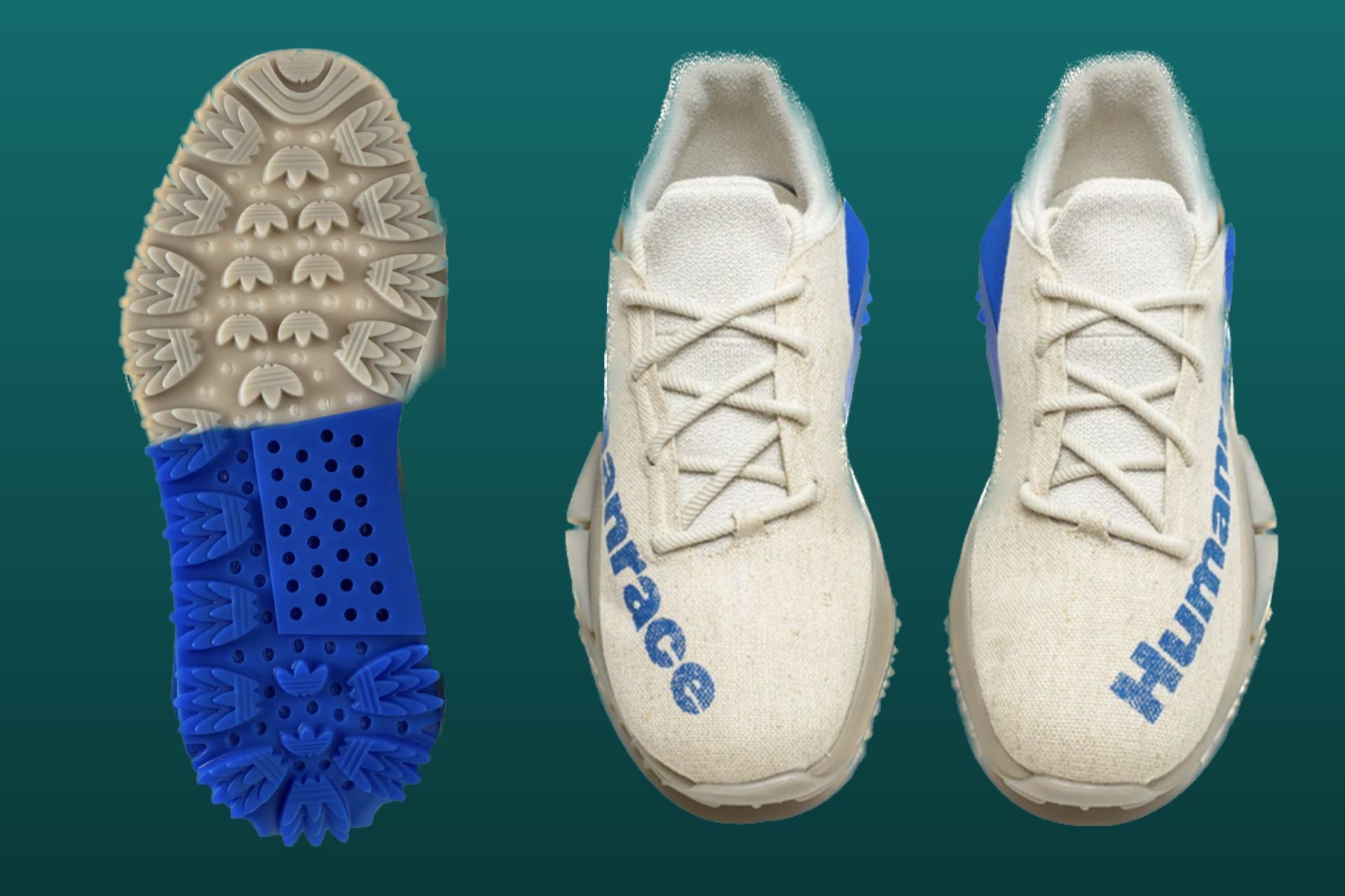 The rope laces that are connected to the eye stays near to the tongue flaps and collar sections have the same color as those components. A huge piece of the shoe heel counter is emphasized with rich blue hues, and the "Humanrace" label is printed across the whole side. Additionally, white materials are used to complete the interior of the shoe.