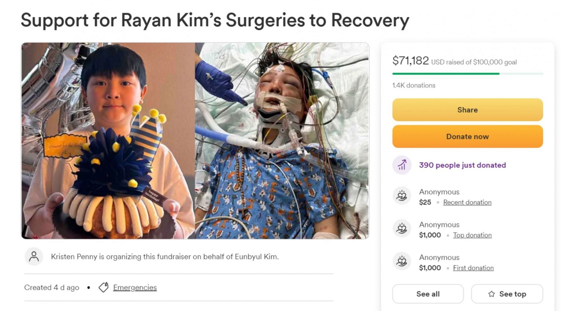 In an update to the GoFundMe, Penny revealed that it was a miracle that the boy was still alive. While on the fundraiser page, Kristen Penny said that a two-hour surgery was performed on Rayan Kim, but doctors were still not 100% sure about his eyesight. His hearing was also not fully recovered, but they were still hopeful. The bones surrounding his eyes needed surgery and wiring.