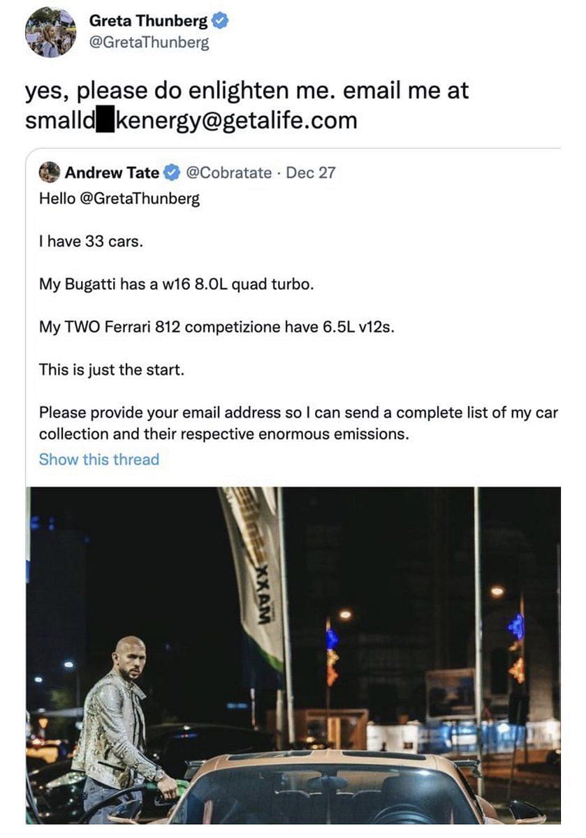 On December 27 of 2022, Tate tweeted tagging the Swedish teen climate activist Greta Thunberg, mentioning his total of 33 cars and offering to send her a list of their names and the enormous emissions. Thunberg, who is known for her firm response to world leaders, replied "yes, please do enlighten me. email me at smalldickenergy@getalife.com."
