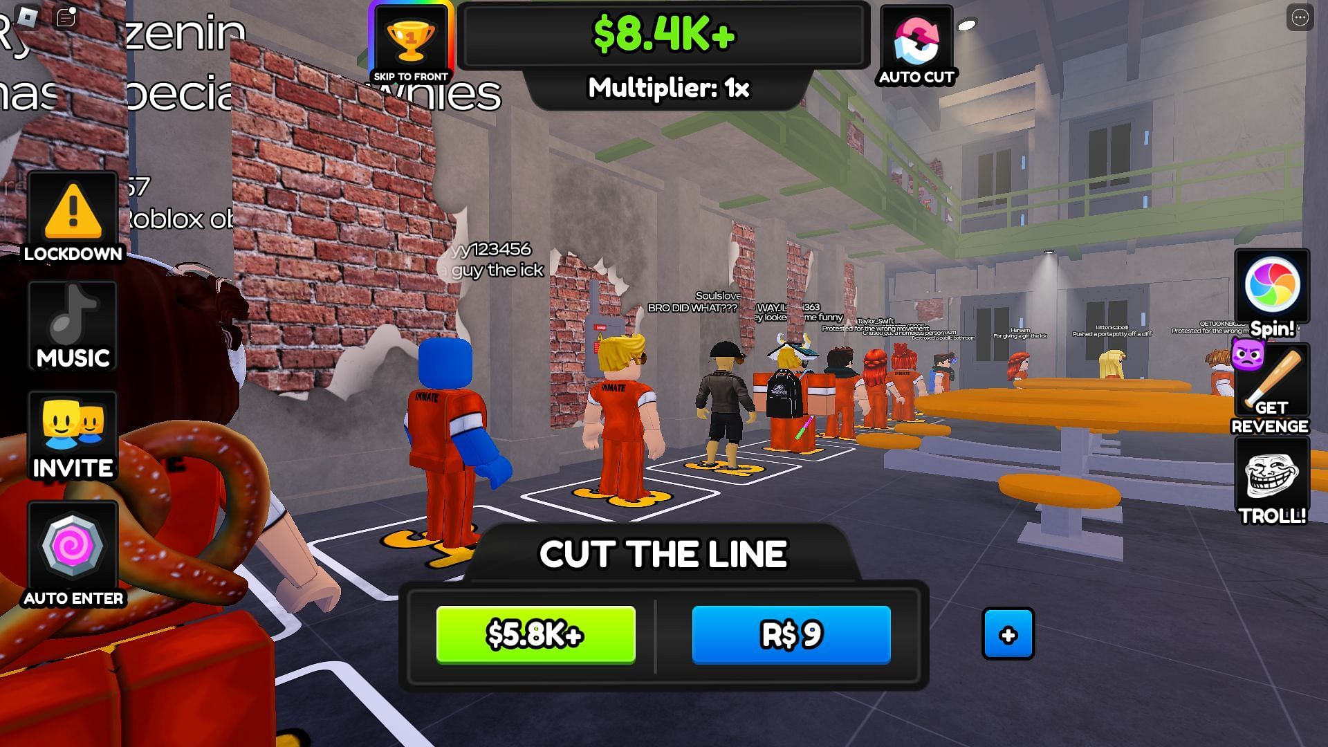 - Premium Features: You can use Robux to access various premium features, such as cutting in line, spins, and revenge against those who cut you off. These optional purchases double as quality-of-life features, allowing you to enter the execution room in a quicker or more enjoyable manner.
