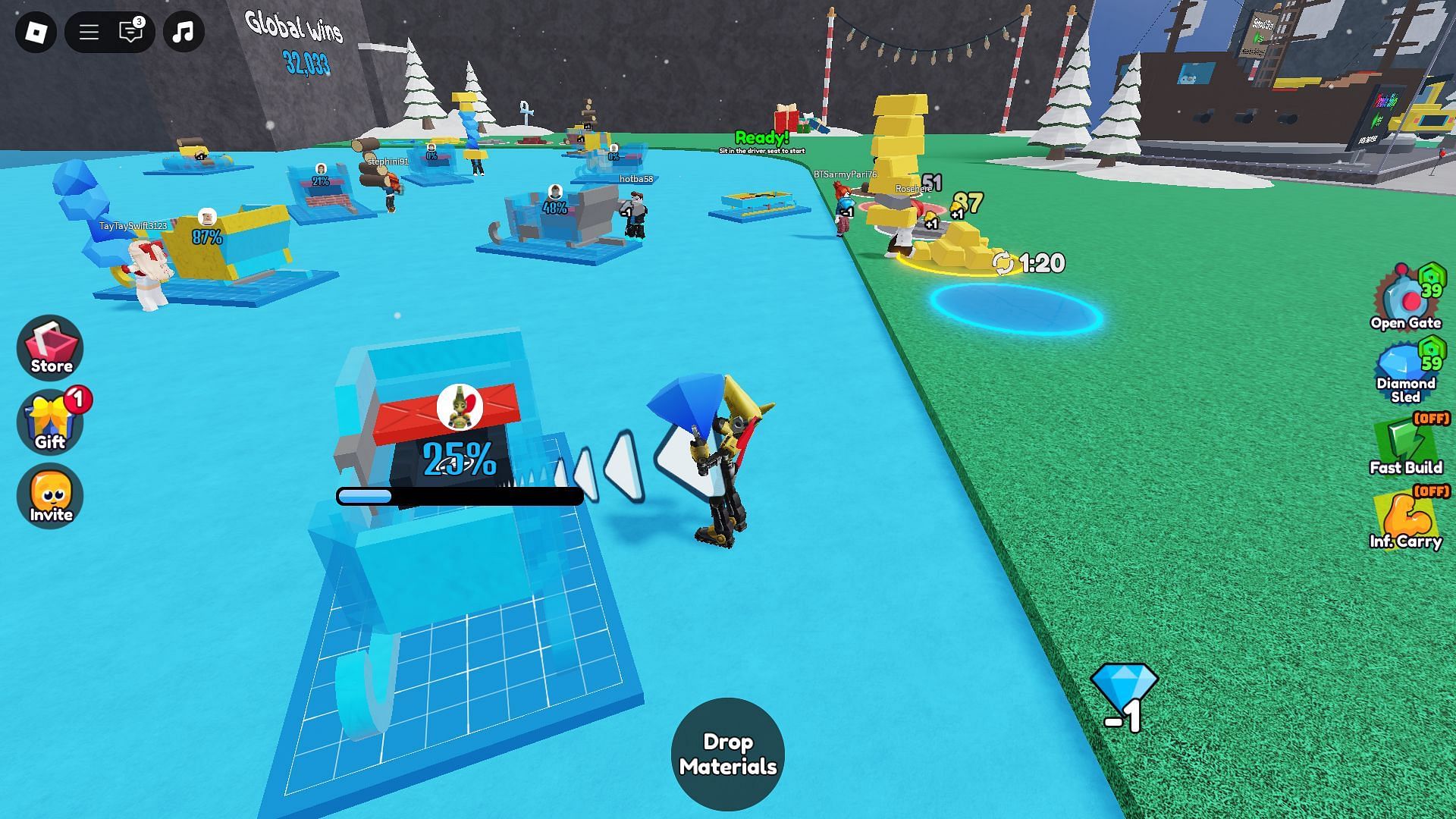 Upon placing the blueprint, you will need to collect resources to build the ride. These resources, which include diamonds, gold, wood, bricks, etc can be found next to the icey area. You can pick them up and build your ride for the main event.