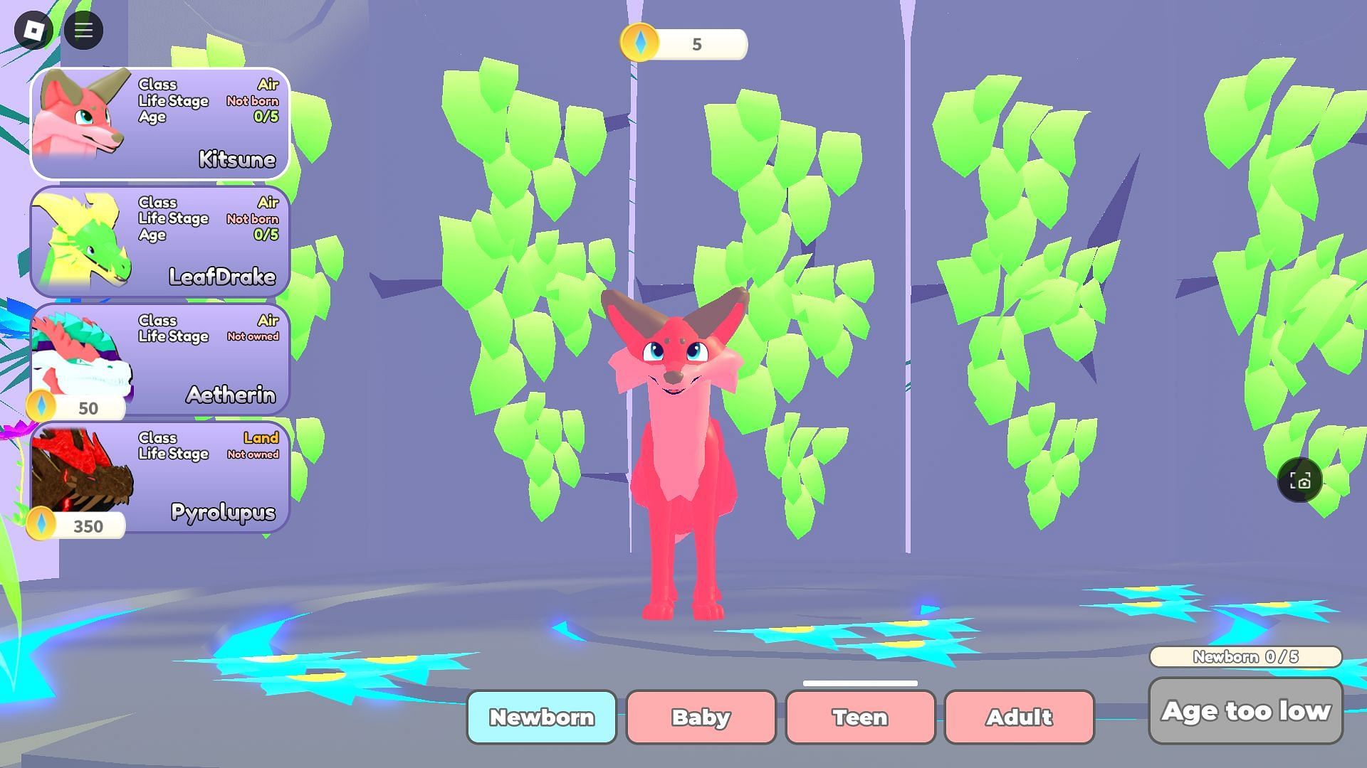 The game features four distinct creatures to play as, along with your avatar. You can select a creature to play as at any time using the Creatures button. Swapping playable creatures does not cause the current one to reset its age; rather, the game saves the progress. This lets you pick up where you left off with one creature, should you feel the need to play as another for a while.