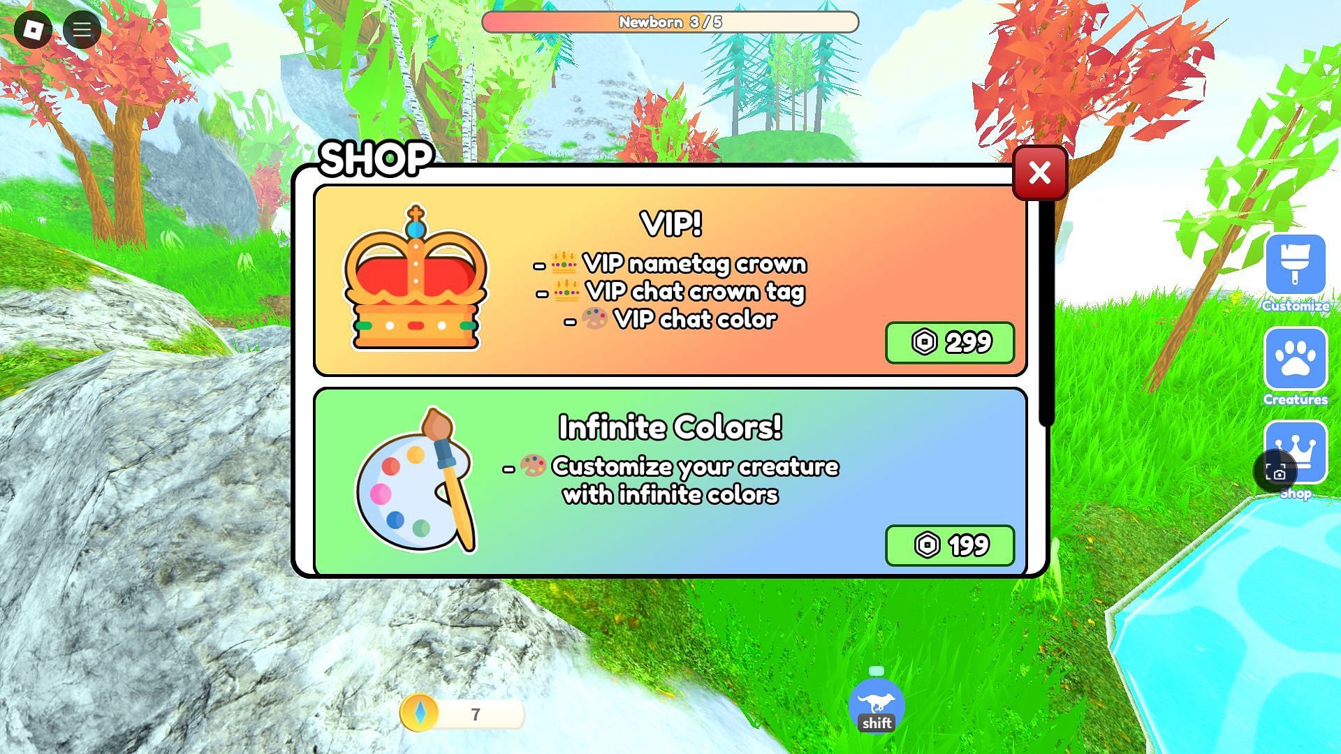 The game includes three game passes in its shop: the VIP Membership, Infinite Colors, and Creature Resize. With the VIP Membership, you will receive a crown next to your name, a crown tag in the chat, and a unique chat color. The other options give you access to a color picker and let you resize the creature, respectively.