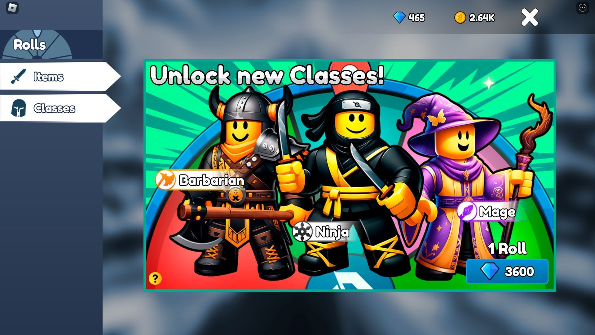- Class Rolls: You can unlock new Classes by accessing the Classes tab in the Rolls menu. Gain access to new abilities and weapon types by spending 3,600 Diamonds for one roll. The available Classes include Barbarian, Ninja, Mage, and more.