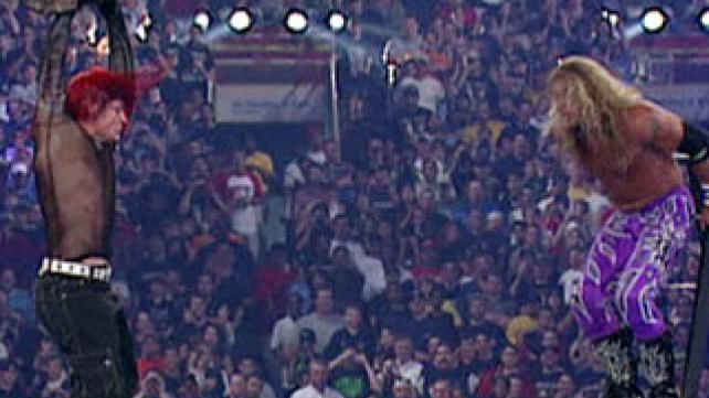 Hardy grabbed the belt but was left hanging after Bubba Ray Dudley removed the ladder. Edge then, jumped from the top of another ladder, striking Jeff with a mid-air spear.