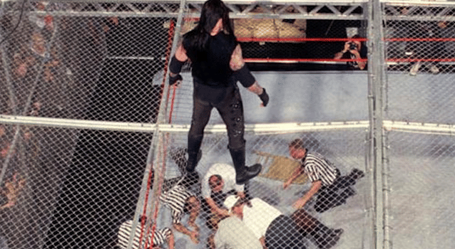 This surely has the one of the most brutal falls in the WWE with Mankind (Mick Foley) getting thrown off the top of the cell and crashing through the announce table below.