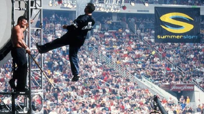 This is one of Shane McMahon’s infamous match with Steve Blackman for Hardcore Championship in SummerSlam 2000. Shane tried to climb the Titantron to get away from Blackman the plan seemed to have backfired him. Blackman followed him all the way to the top and attacked him with a Kendo Stick, resulting in making him fall to the floor.