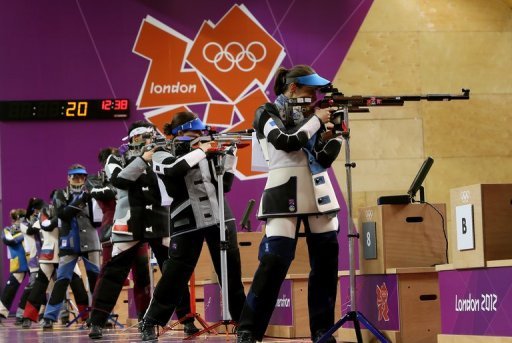Shooters compete in the 50m rifle 3 positions women’s final at the Royal Artillery Barracks on Saturday. Beate Gauss, 27, who took part in the 10m air rifle event at the London Olympics, recently appeared topless on the front cover of Playboy in Germany along with other Olympians.
