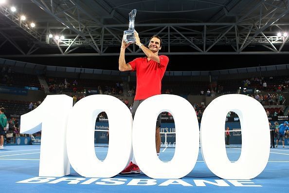 34) 11th January 2015: Federer beats Raonic 6-4 6-7(2) 6-4 in the Brisbane final for his 83rd singles title and 1000th match win, joining an exclusive club of Connors (1274) and Ivan Lendl (1068) to have registered four-digit singles match wins in the Open Era.
