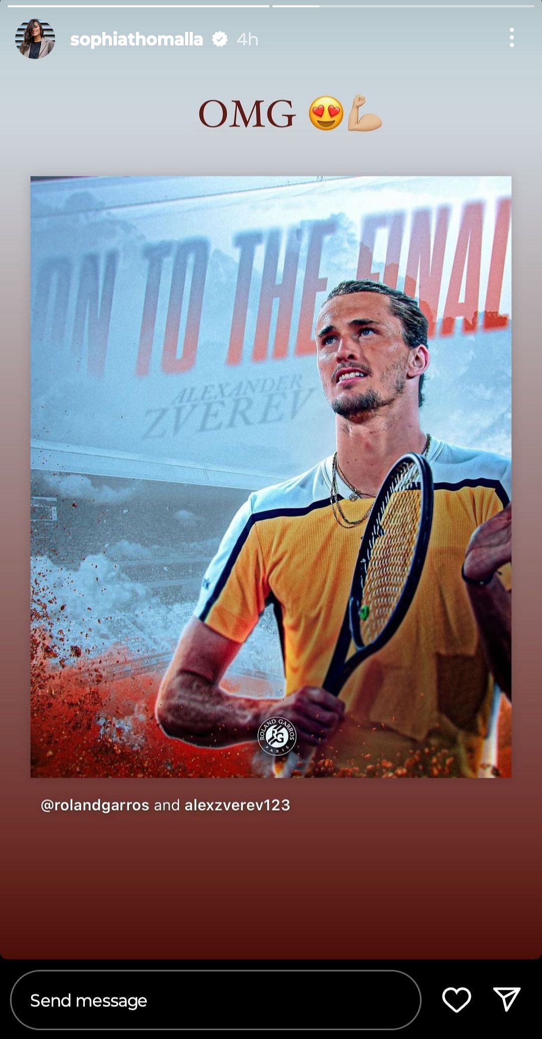Ahead of the final against Carlos Alcaraz, Alexander Zverev's girlfriend, German model Sophia Thomalla, shared her excitement on Instagram. She posted an image of Zverev celebrating his victory, which was edited into a poster.