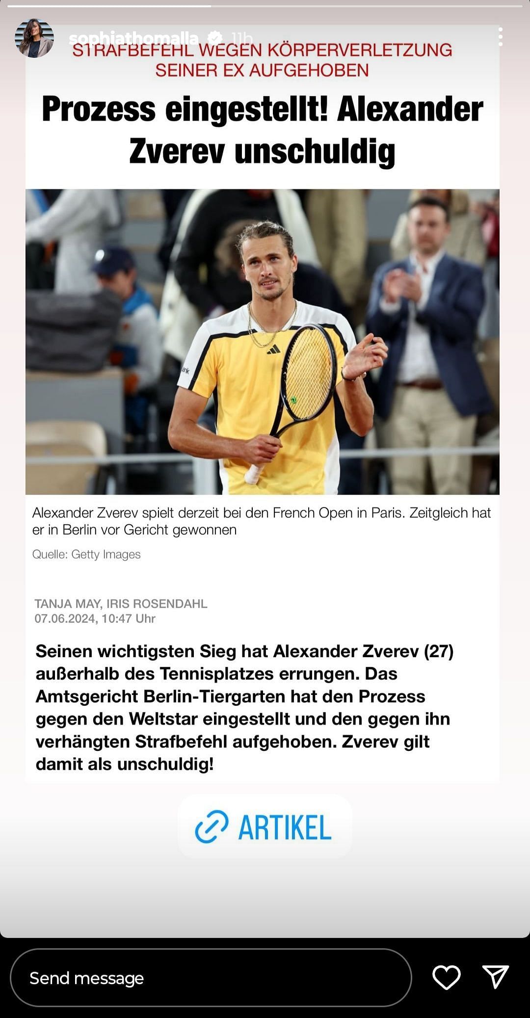 Thomalla also shared a screenshot of a German article expressing her happiness over the news that Zverev had been cleared of any violations regarding the allegations.