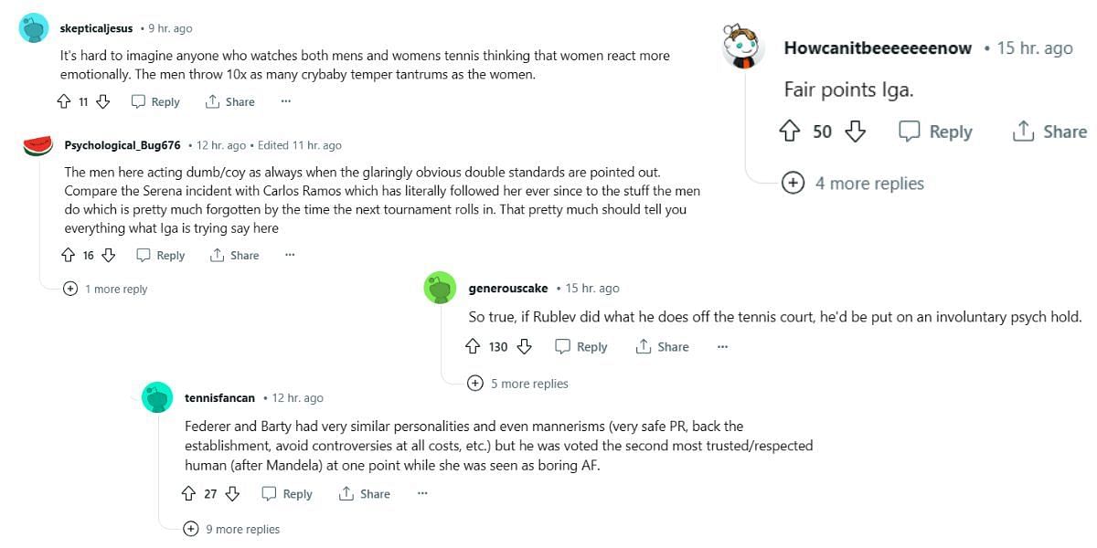 "I mean the clip of Aryna breaking the rackets after USO final went viral and she was called the nastiest sh*t as the prime example. Or Iga crying after losing in UC and getting shit on in contrast to praise for Carlos [Alcaraz] after Cincy final... there's too many examples"