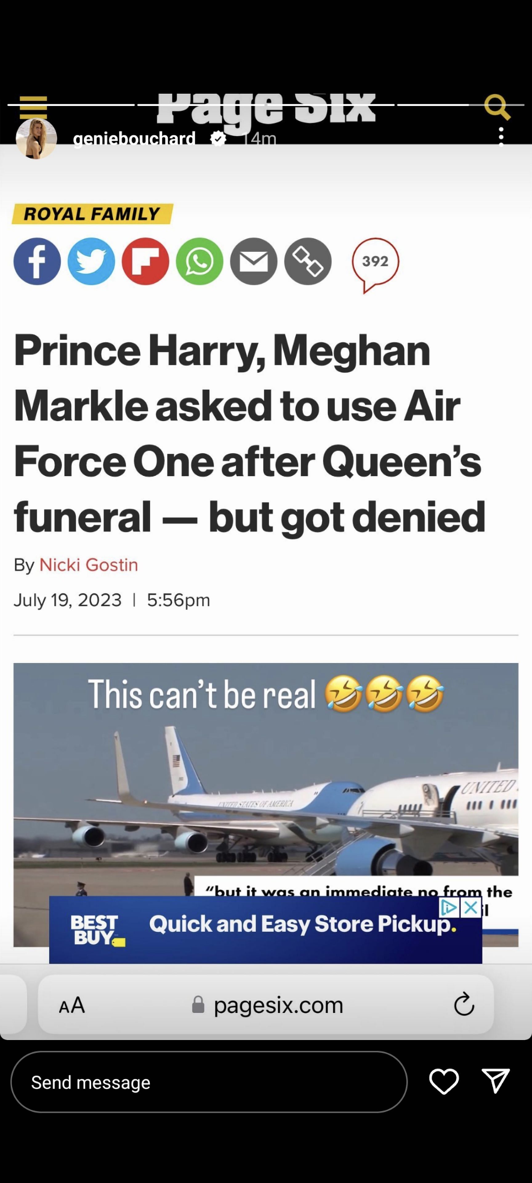 Bouchard recently took to social media to share a screenshot of a news article which claimed that Prince Harry and Meghan Markle were denied access to Air Force One alongside President Joe Biden after Queen Elizabeth's funeral. The Canadian accompanied the image with a caption suggesting that the news could not be "real."