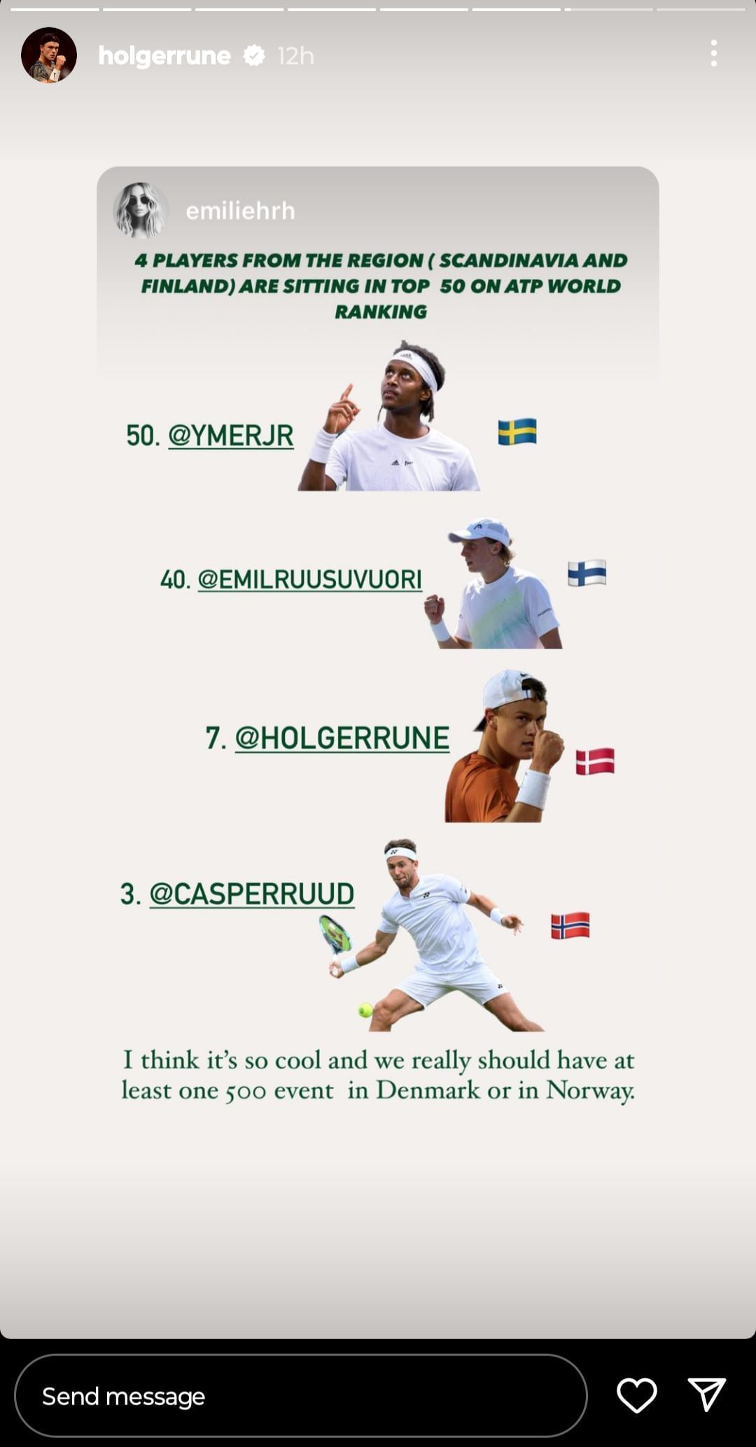 “4 players from the region (Scandinavia and Finland) are sitting in Top 50 on ATP World ranking,” Emilie wrote on her Instagram story. “I think it’s so cool and we really should have at least one 500 event in Denmark or in Norway.”