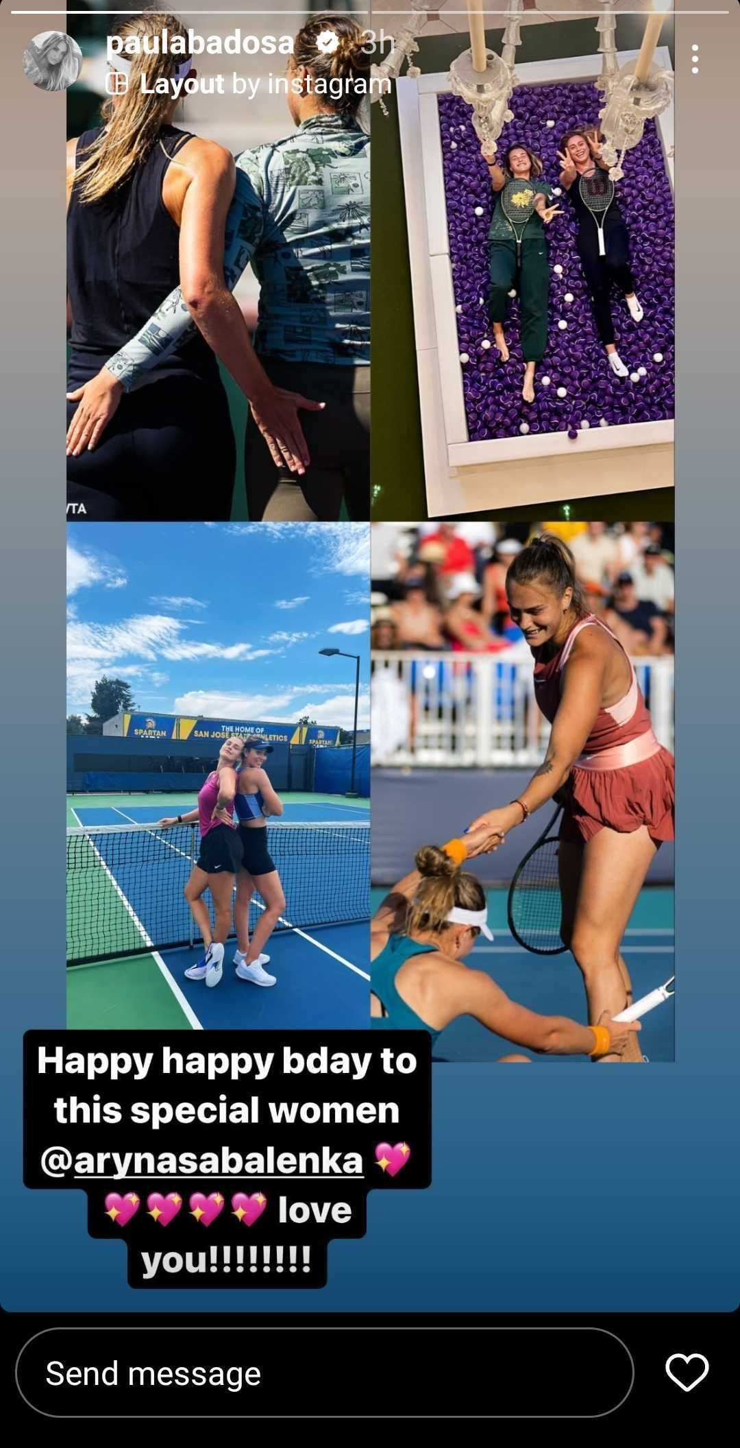 "Happy happy birthday to this speacial woman Aryna Sabalenka, Love you!!!!!!!," Paula Badosa wrote.