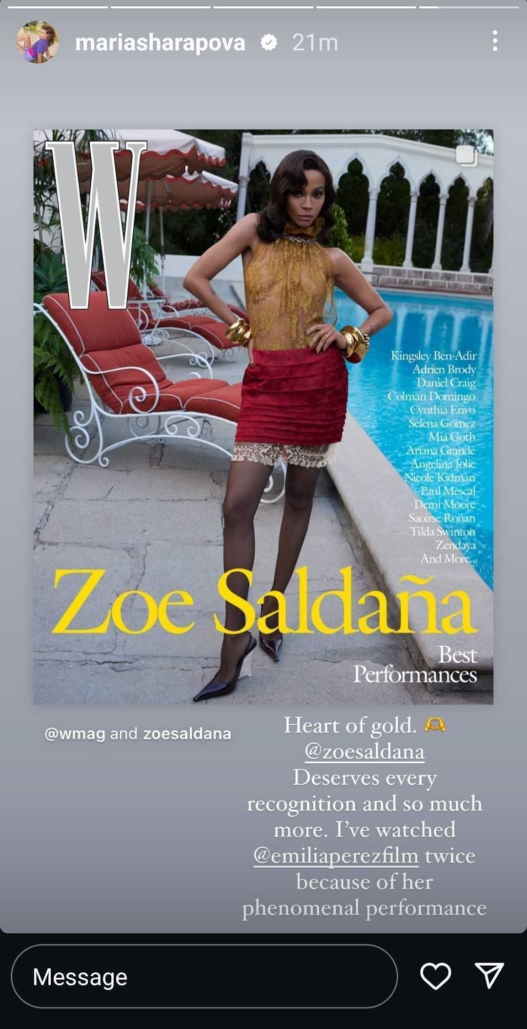 "Heart of gold. @joesaldana Deserves every recognition and so much more. I have watched @emiliaperezfilm twice because of her phenomenal performance." posted Sharapova on her Instagram story.