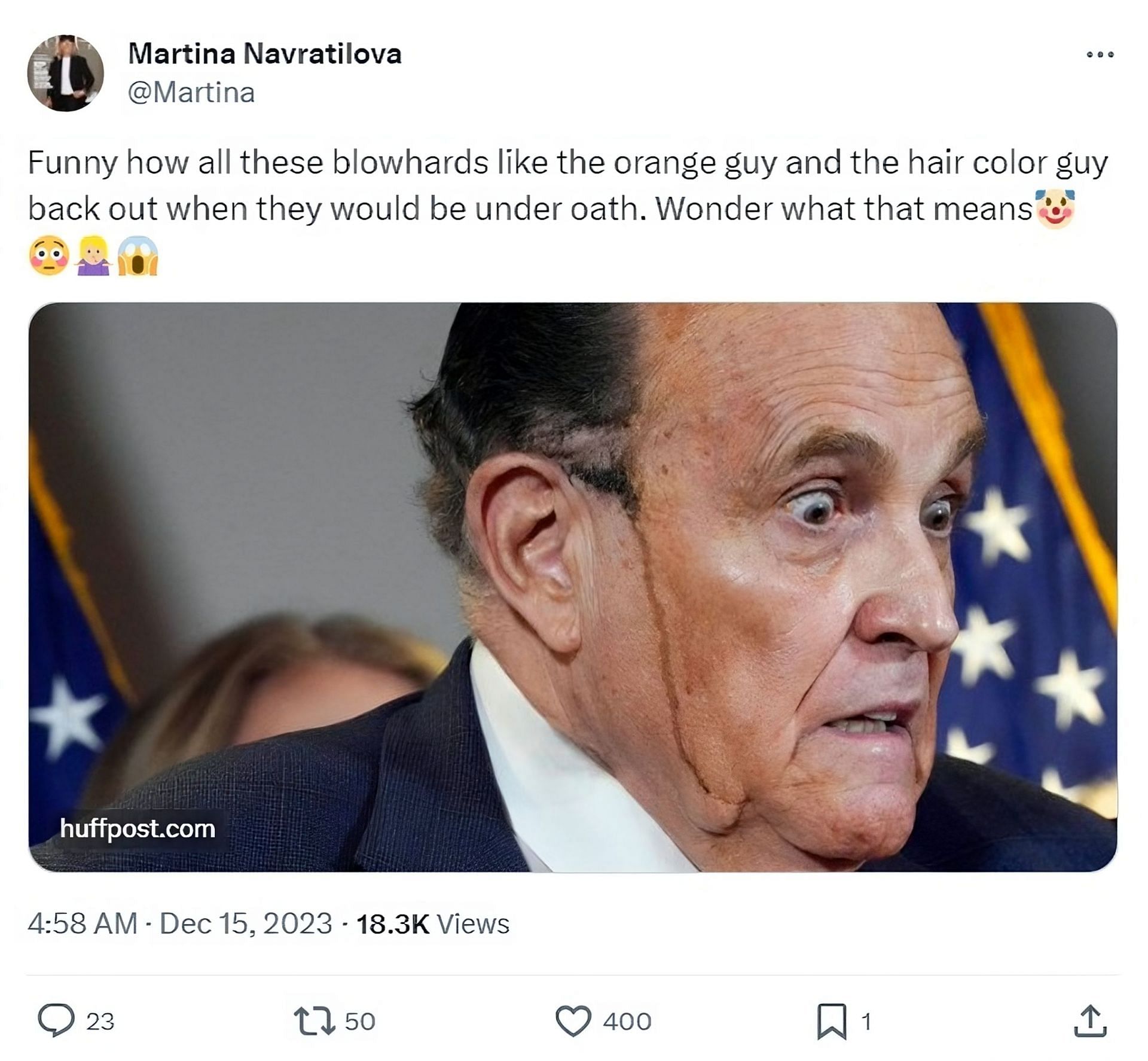 "Funny how all these blowhards like the orange guy (Trump) and the hair color guy (Giuliani) back out when they would be under oath. Wonder what that means," Navratilova wrote on X (formerly Twitter).