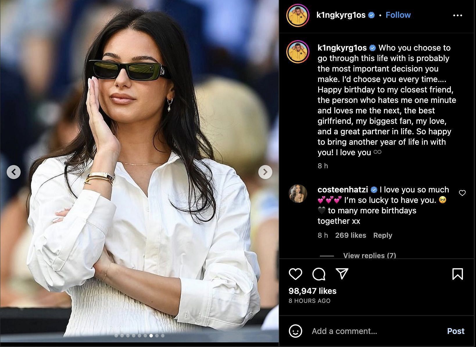 Nick Kyrgios pens heartfelt birthday message for girlfriend Costeen Hatzi
