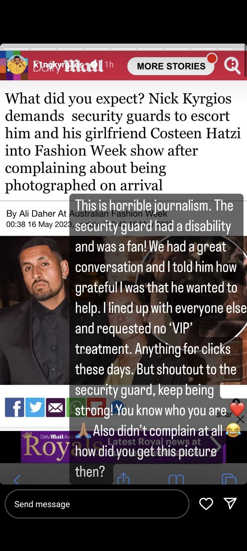“This is horrible journalism,” Nick Kyrgios said in an Instagram story. “Anything for clicks these days.”