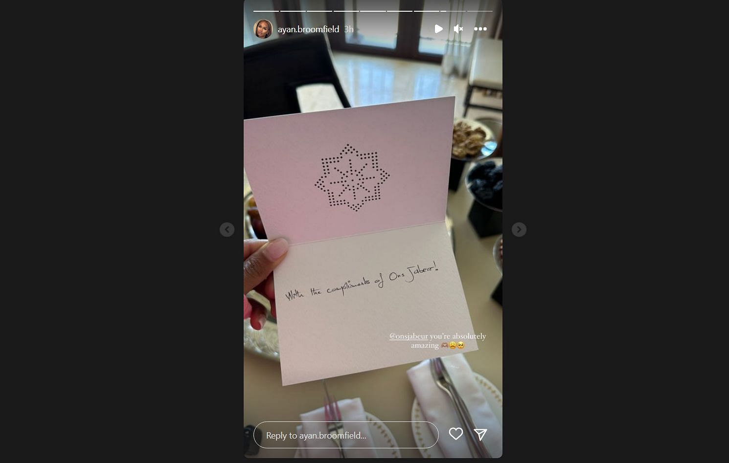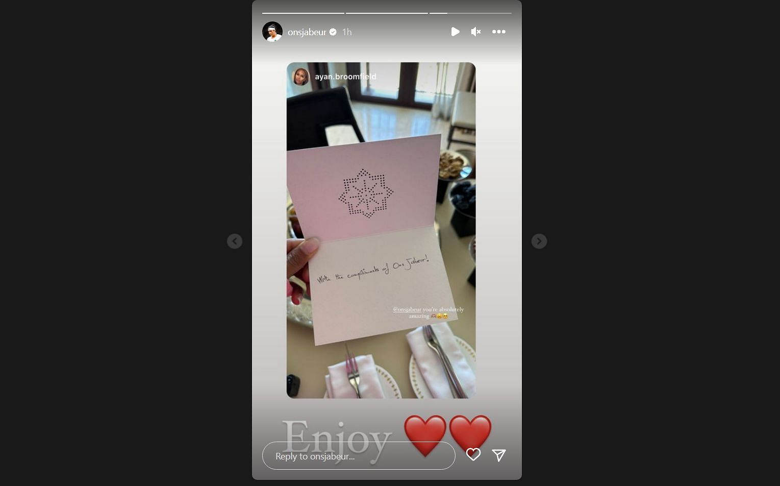 Jabeur later replied to Ayan Broomfield's Instagram story, telling the couple to enjoy their time together.
