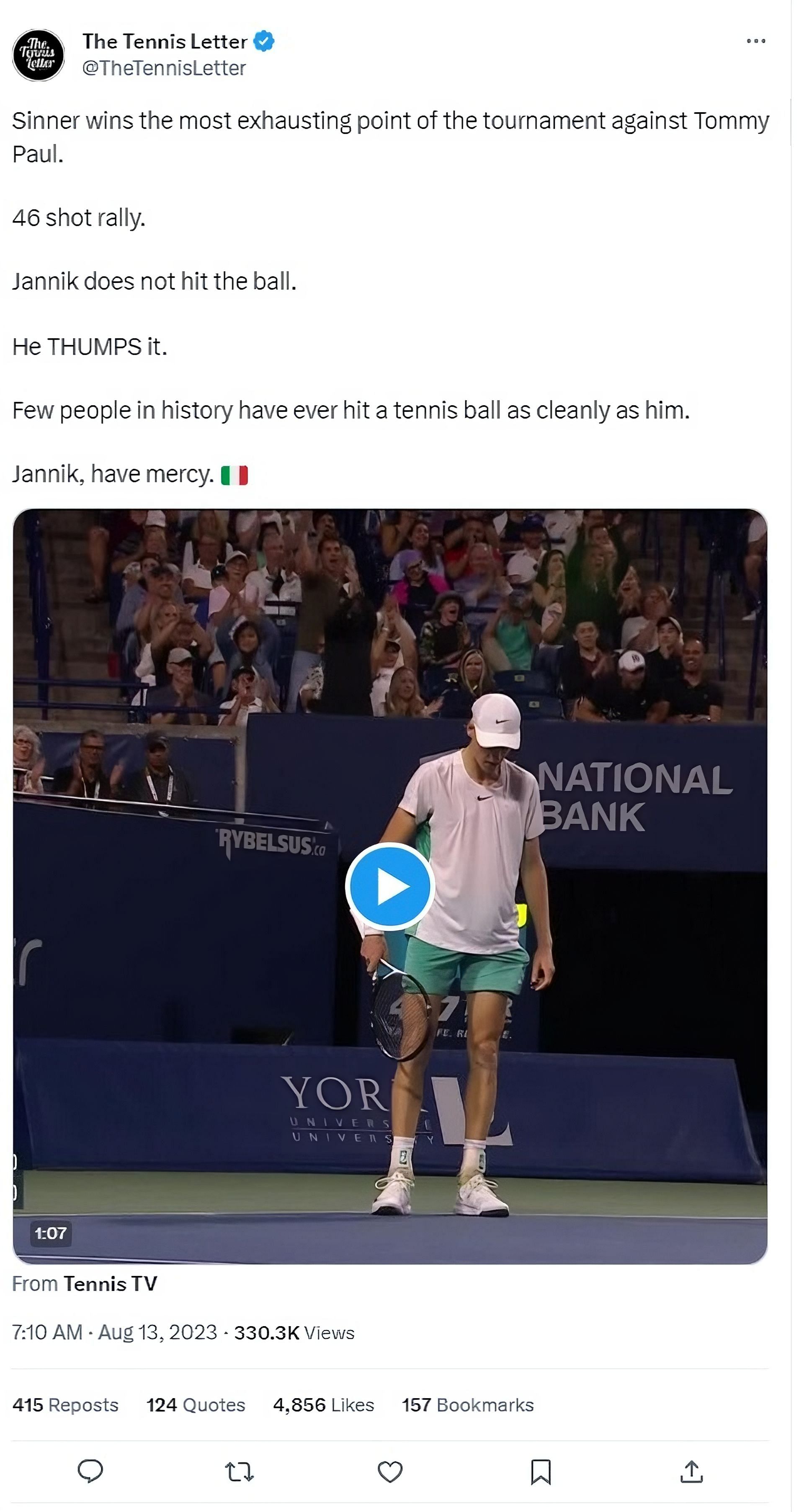 "Sinner wins the most exhausting point of the tournament against Tommy Paul. 46-shot rally. Jannik does not hit the ball. He THUMPS it. Few people in history have ever hit a tennis ball as cleanly as him. Jannik, have mercy," the caption read.