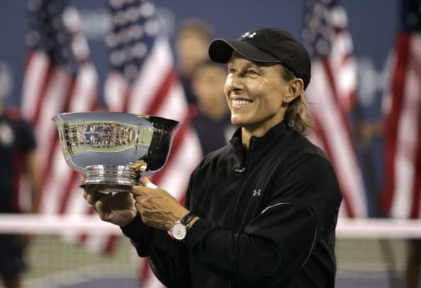 Martina Navratilova and Bob Bryan win the mixed doubles final against Kveta Peschke and Martin Damm at the 2006 US Open at the USTA National Tennis Center in Flushing Queens, New York on September 9, 2006. (Photo by Mike Ehrmann/Getty Images)