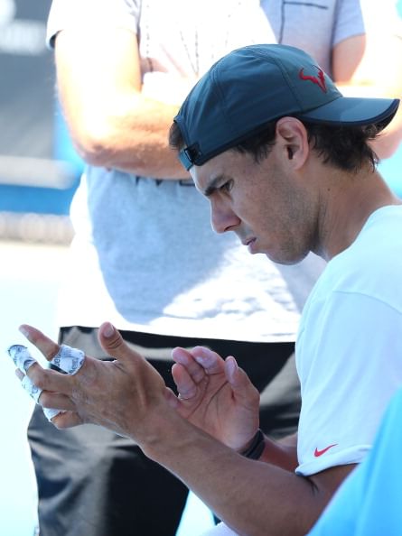 MELBOURNE, AUSTRALIA – JANUARY 23: Rafael Nadal of Spain looks at his hand during a practice session on day 11 of the 2014 Australian Open at Melbourne Park on January 23, 2014 in Melbourne, Australia. (Photo by Chris Hyde/Getty Images)
