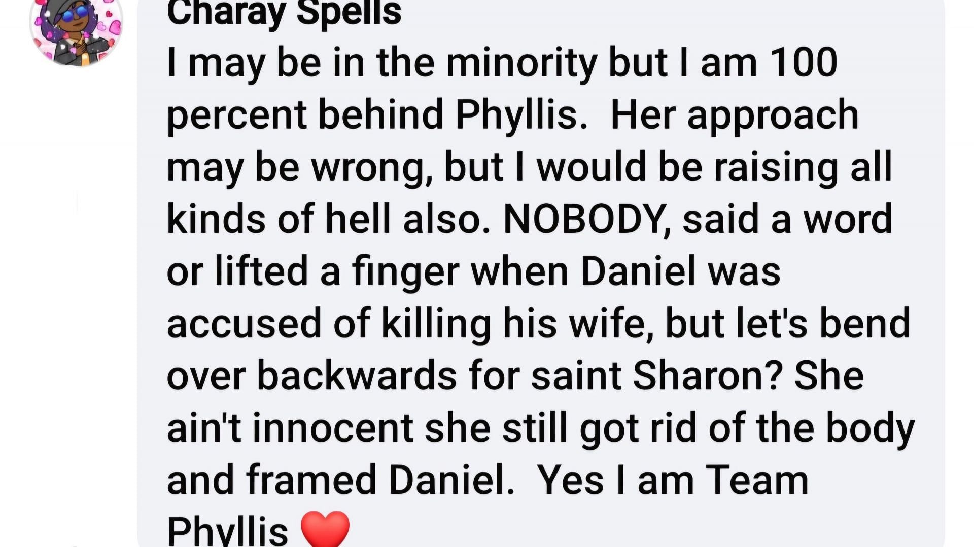 However, a few viewers also tried to understand Phyllis' perspective and reaction to the situation, claiming that she had the right to respond with mistrust towards anything that Sharon might say about the case.
