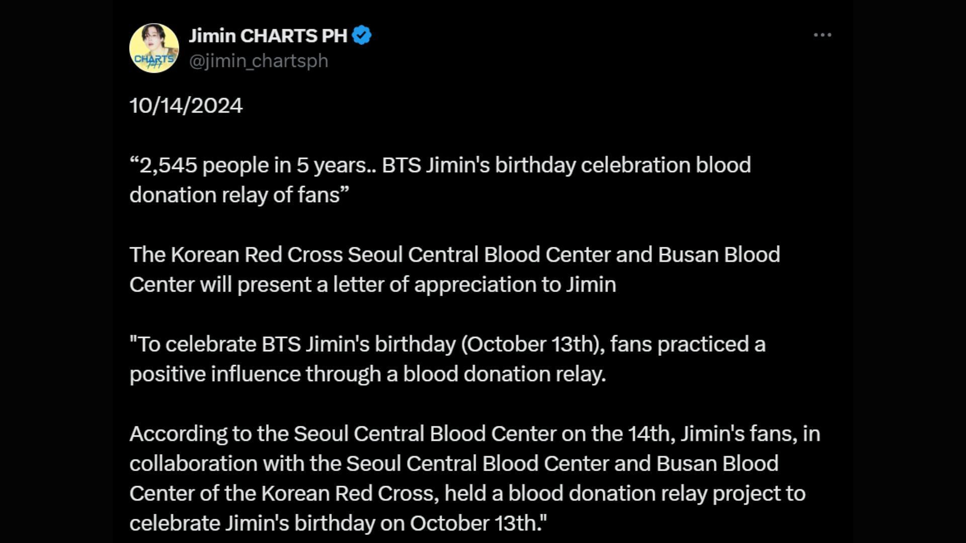 Meanwhile, the Latin fanbase "JiminLatinFB" donated to the American Cancer Society to support breast cancer research, as well as to the Wildlife Conservation Network to help preserve endangered wildcats.