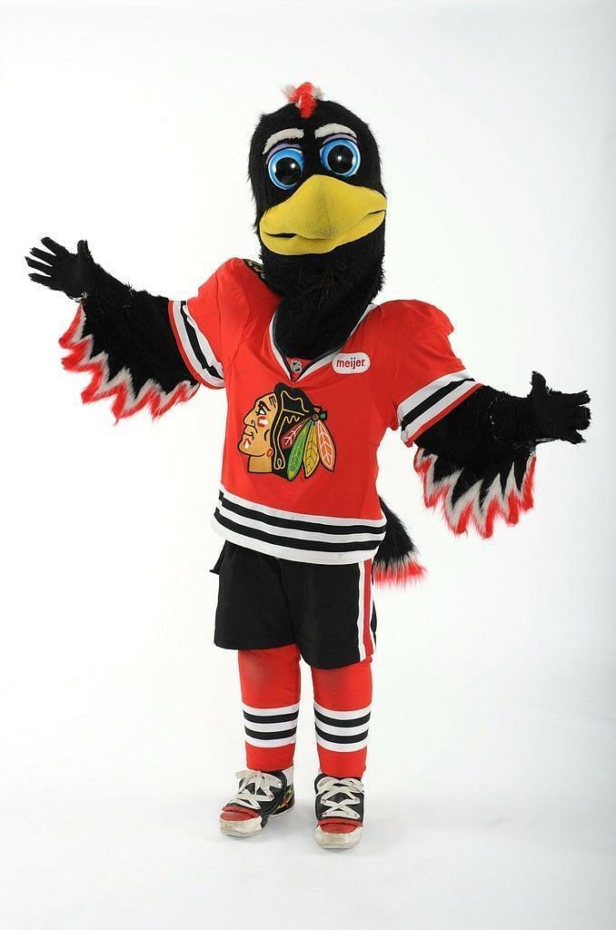 The Chicago Blackhawks mascot Tommy Hawks is a lively fun black hawk that represents the team. He is known for his distinctive four feathers on his head, wearing a black jersey and hockey pants. Tommy was introduced in the 2001-2002 season and quickly became a centre of attraction among the fans.