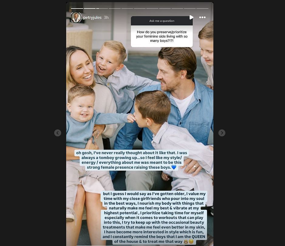 Julie Petry, the wife of Detroit Red Wings player Jeff Petry, shared on Friday how she maintains her feminine side while raising her boys Boyd, Barrett, Bowen and Blake. She shared in an Instagram Q&A that growing up a tomboy helped her embrace being a strong female role model for her sons.