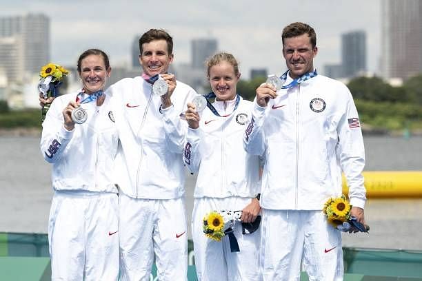 Team USA won silver in the mixed triathlon relay at the 2020 Tokyo Olympics, 14 seconds behind Great Britain. Morgan Pearson, Kevin McDowel, Katie Zaferes, and Knibb Taylor made up the American squad. Each of the four competitors alternated between a 300-meter swim, an 8-kilometer bike ride, and a 2-kilometer run during their leg of the relay. McDowell had the team's fastest time at 20:14.