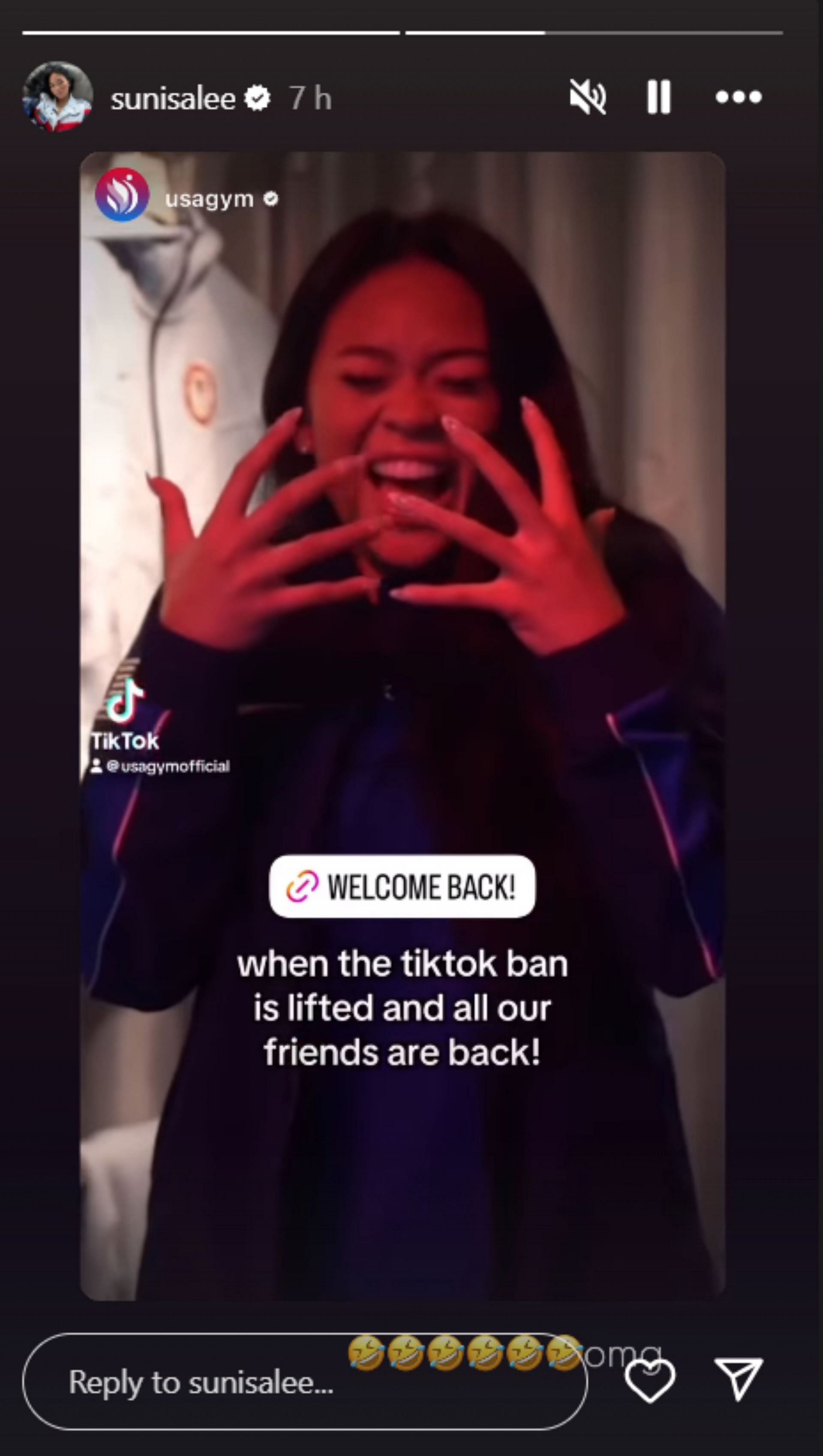 Lee's New Year's kicked off with more brand campaigns before a new Supreme Court law banned the popular video-sharing app TikTok. As per recent news, Donald Trump announced that TikTok could be used until he signed an executive order to delay the ban. The update excited all US users, including Suni Lee, who shared USA Gymnastics' Instagram story to react to a clip featuring her.