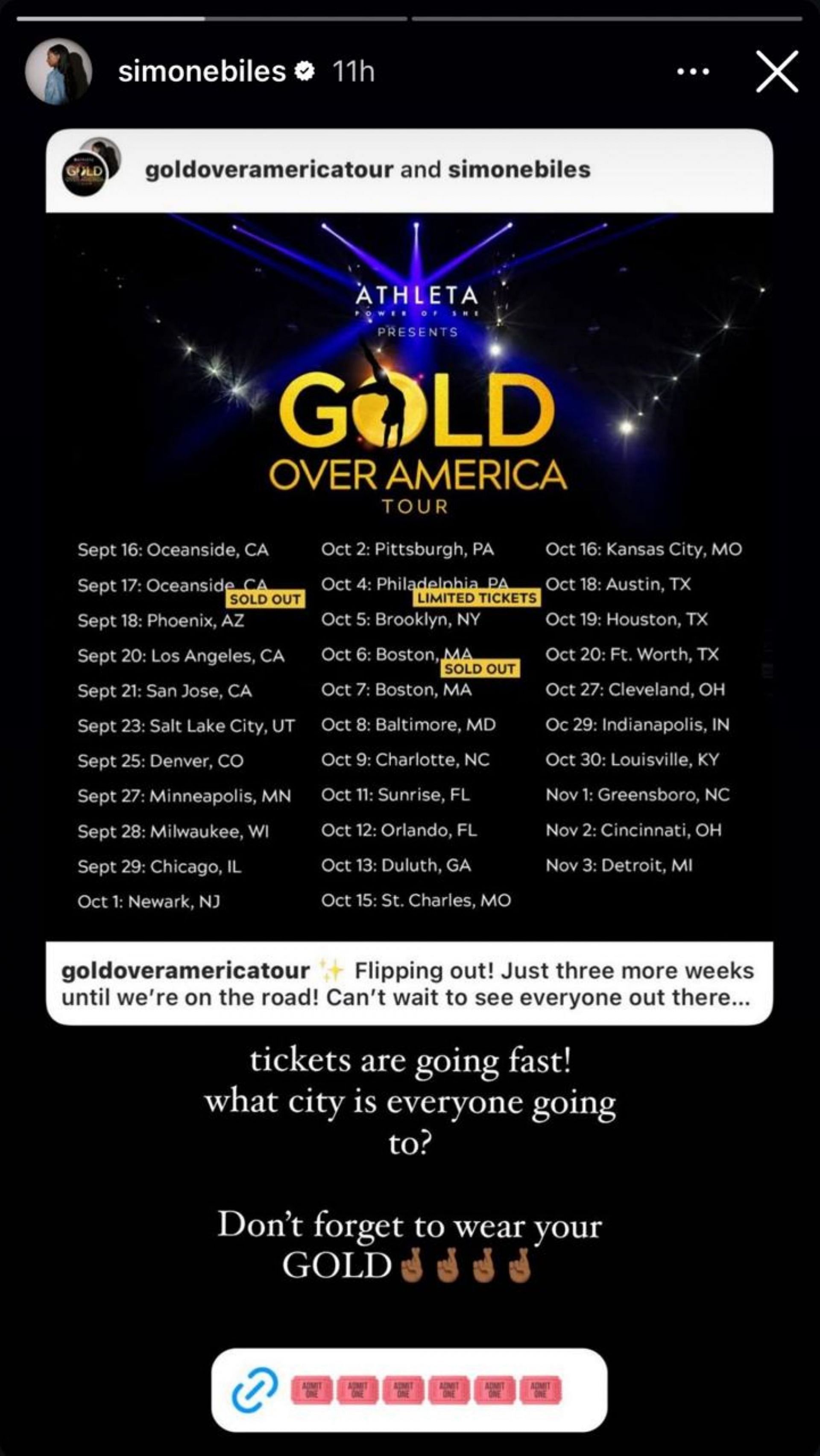 Simone Biles recently pointed out that the tickets for her Gold Over America Tour are running out. She also reminded everyone to wear their "gold" at the events, which will be held in different cities in the USA. The tour will commence on September 16 and continue till November 3, 2024.