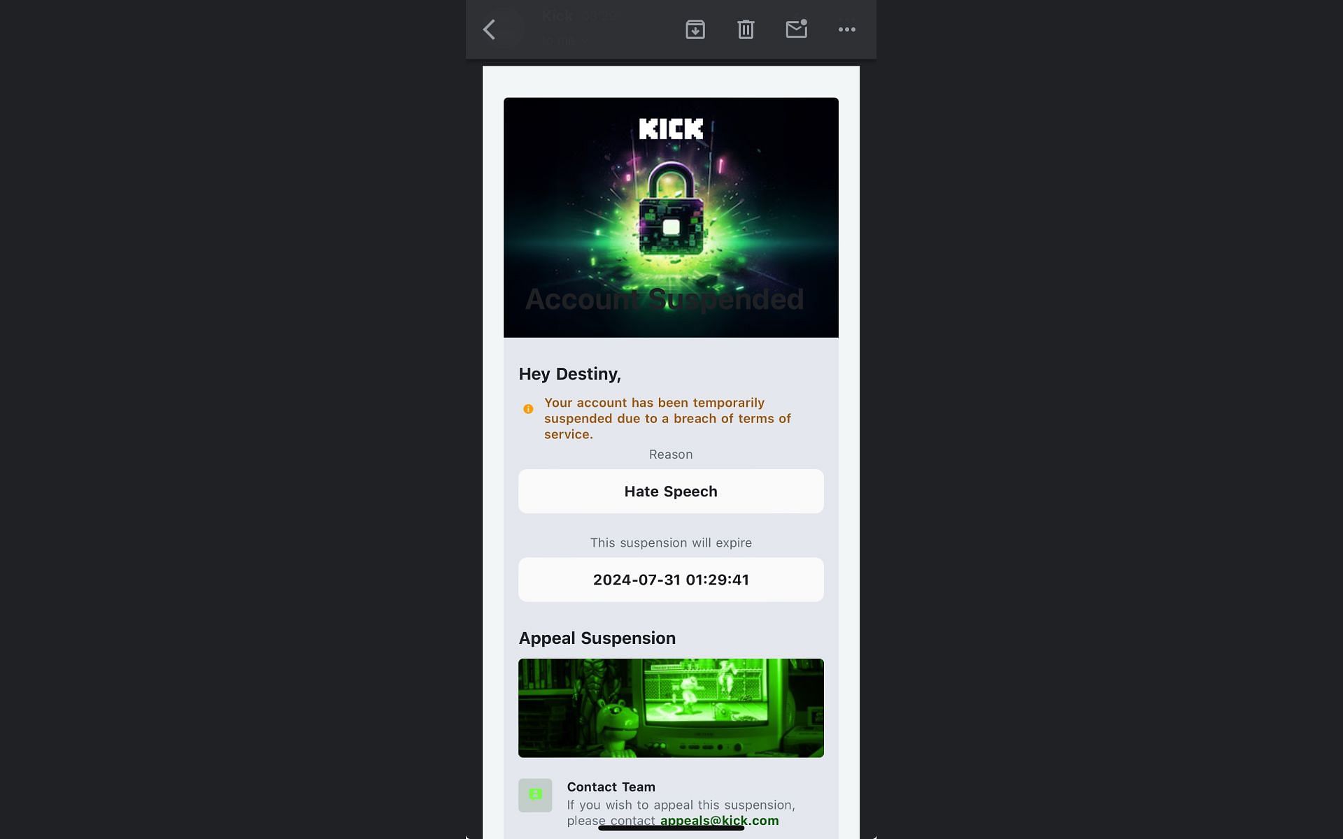 Destiny eventually revealed that he had been temporarily banned from Kick due to "hate speech." An official email from the platform provided the following information: