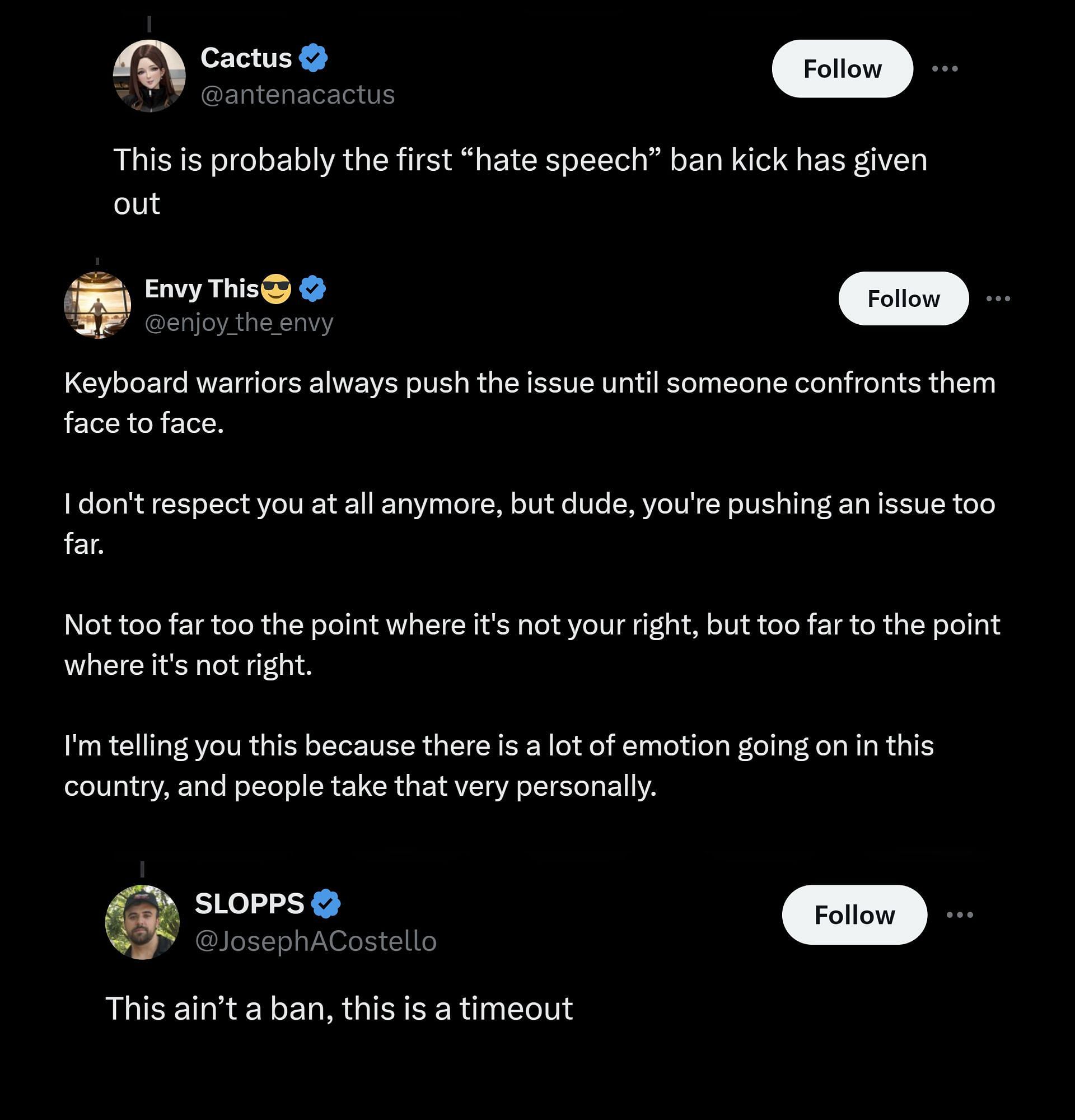 "This is probably the first 'hate speech' ban kick has given out," said X user @antenacactus.
