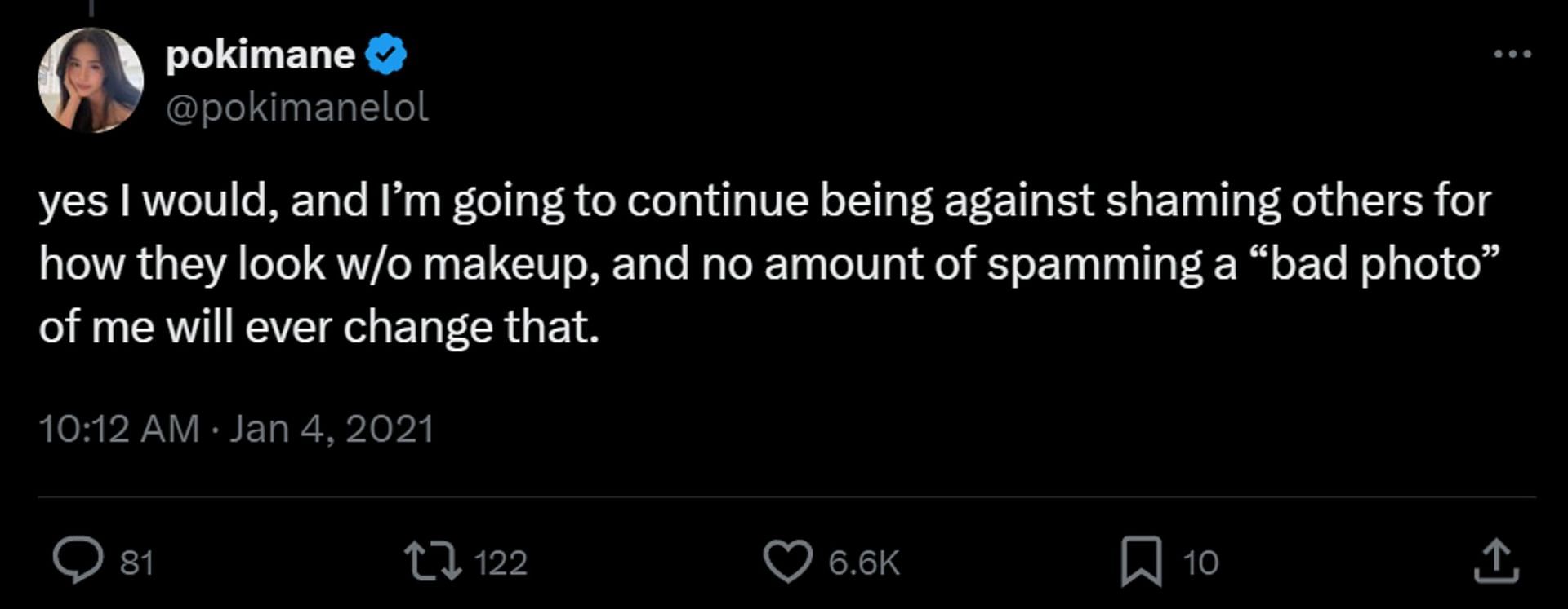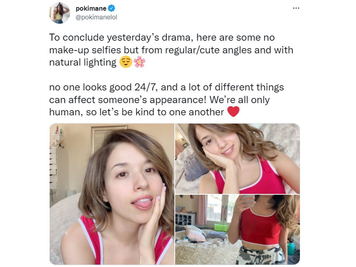 Following her October 2018 stream, where a screenshot of her without makeup surfaced, Pokimane took to X.com to share additional photos of herself with minimal makeup. She emphasized that no one looks "good 24/7." She wrote: