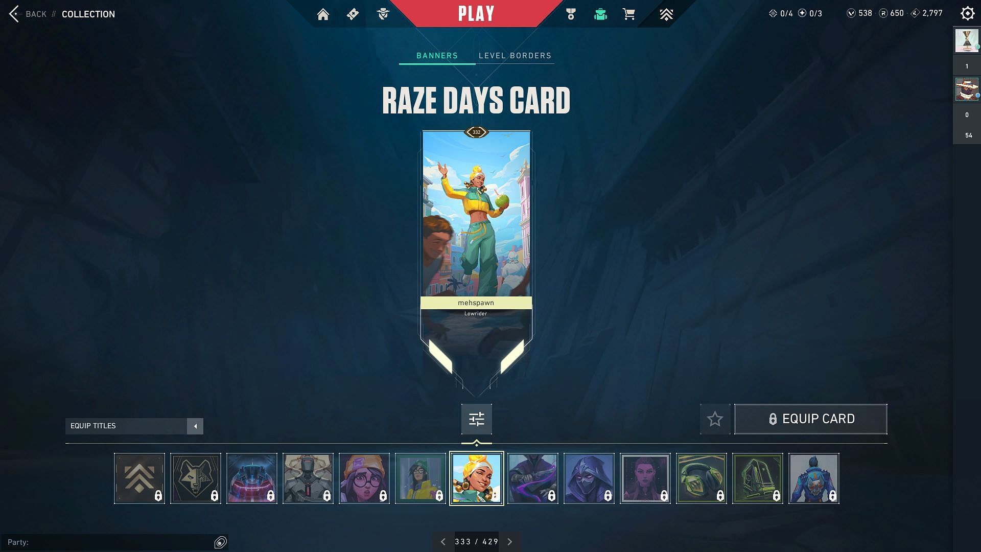 Knife Fight, Raze Days, and three other Raze Player Cards that can be bought in Valorant's Accessories Store
