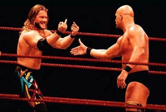 Jericho, ever the brilliant heel, is shown giving Austin the double bird as Austin outstretches his hand for a handshake. Wind up a Rattlesnake though and you’ll get bitten. It’s odd to see Austin on the receiving end of his own taunt and it’s like the two men had a role reversal as Jericho would often use a handshake to gain heat by not going through with it.