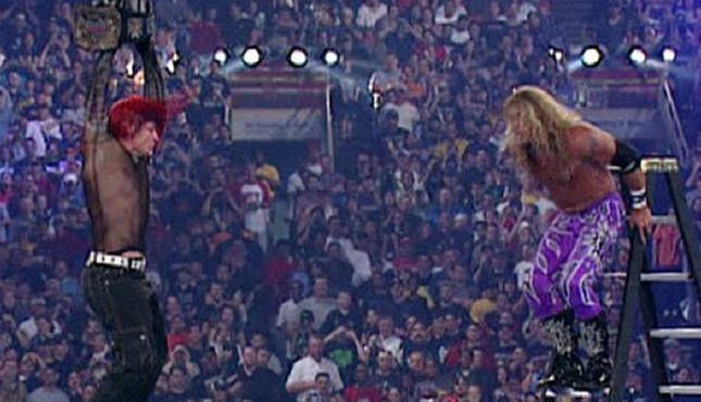 A very young Jeff Hardy had climbed the ladder to reach the belts, before it was knocked out from beneath him, leaving him hanging there. Sensing an opportunity, Edge leaped off a ladder, spearing Hardy to the floor, in so doing creating one of the most memorable Wrestlemania moments of all-time.