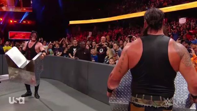 As the fight moved outside the ring, Strowman smashed Kane through the barricade. This caused a double count out, but Strowman continued his attack on Kane. This concluded when he delivered a Running Powerslam to Kane, driving the "Big Red Machine" through the table.