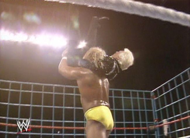 Hogan climbs for the win, but Bundy miraculously recovers long enough to be kicked back down off the top rope; Hogan goes for the top again while Bundy attempts some drama by going for the door, but is a good five feet away from even touching the door when Hogan drops down to the arena floor. As Bundy collapses at ringside, confused by the sight of his own blood, Hogan celebrates by chasing Heenan into the cage so the Hulkster can assault a man roughly one-half to one-third his own size.
