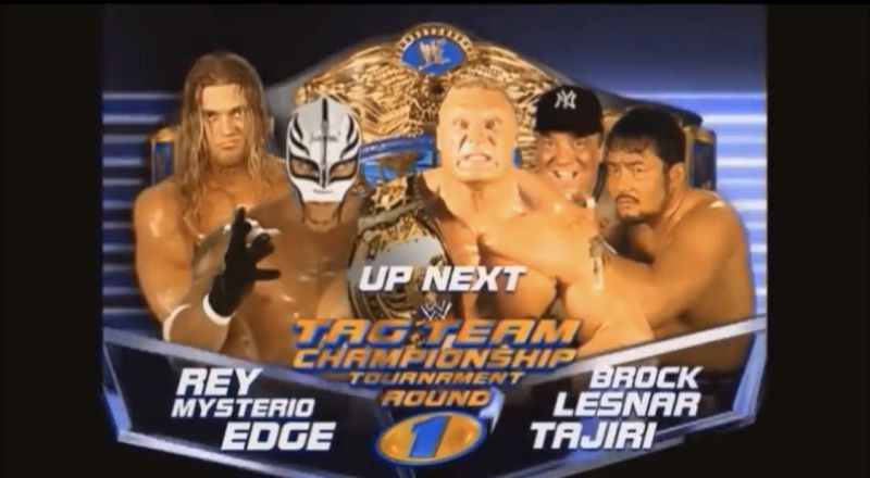 Brock Lesnar's initial run in WWE saw him become WWE Champion in quick succession, when he defeated The Rock at Summerslam 2002. Soon after, WWE came up with a Tag Team Tournament to crown new SmackDown Tag Team Champions at WWE No Mercy 2002. One of the quarterfinals saw Brock Lesnar team up with Tajiri of all people to take on Rey Mysterio and Edge.